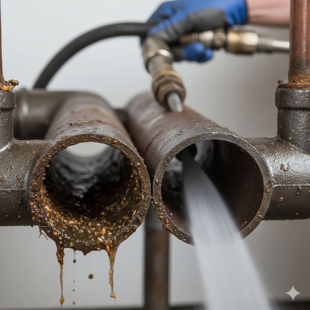 Over time, these materials narrow the pipe, restricting flow and trapping debris. In Philadelphia-area homes, this buildup happens even faster due to aging pipe walls and shared sewer laterals.